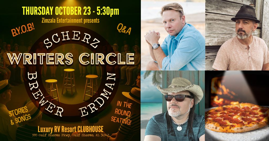 Aaron Scherz, Eric Erdman, and Donny Brewer Thursday Oct 23 at 5:30. Intimate Circle Seating, songs and stories, Q&A, FREE PIZZA, BYOB!!! Luxury RV Clubhouse in Gulf Shores, walking distance from the Hangout.
