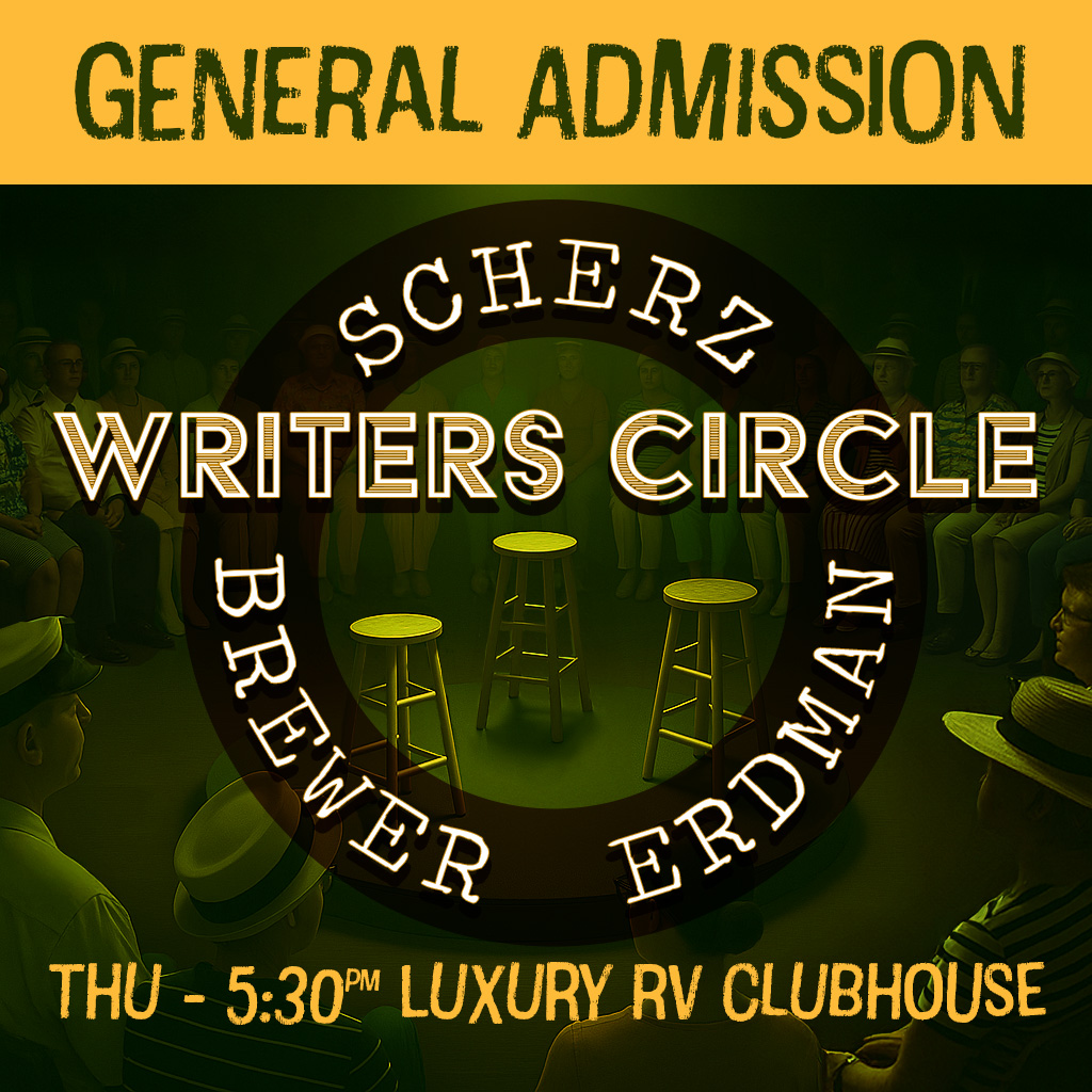 Songwriter’s Aaron Scherz, Eric Erdman, and Donny Brewer perform up close and personal in a Bluebird Cafe style circle Thursday October 23rd, starting at 5:30pm at the Luxury RV Clubhouse. The chairs will be in a circle around the artists as they share stories, songs, and answer questions.